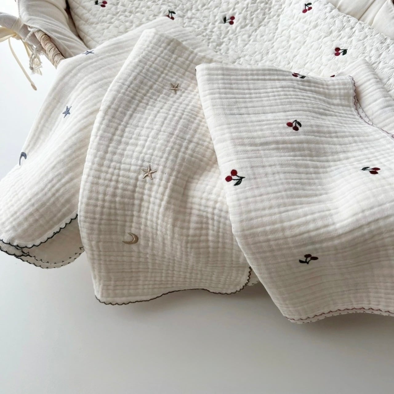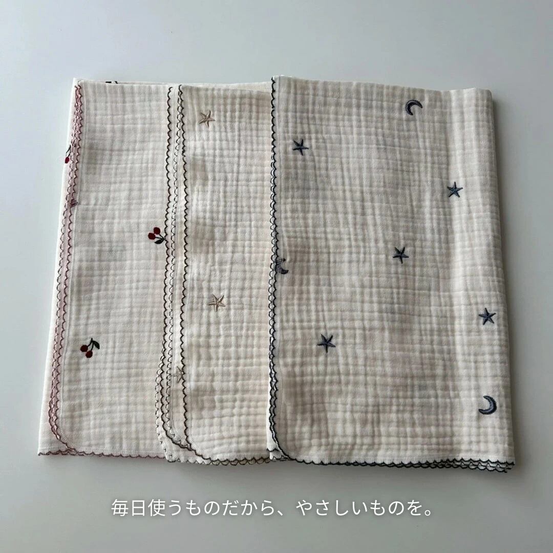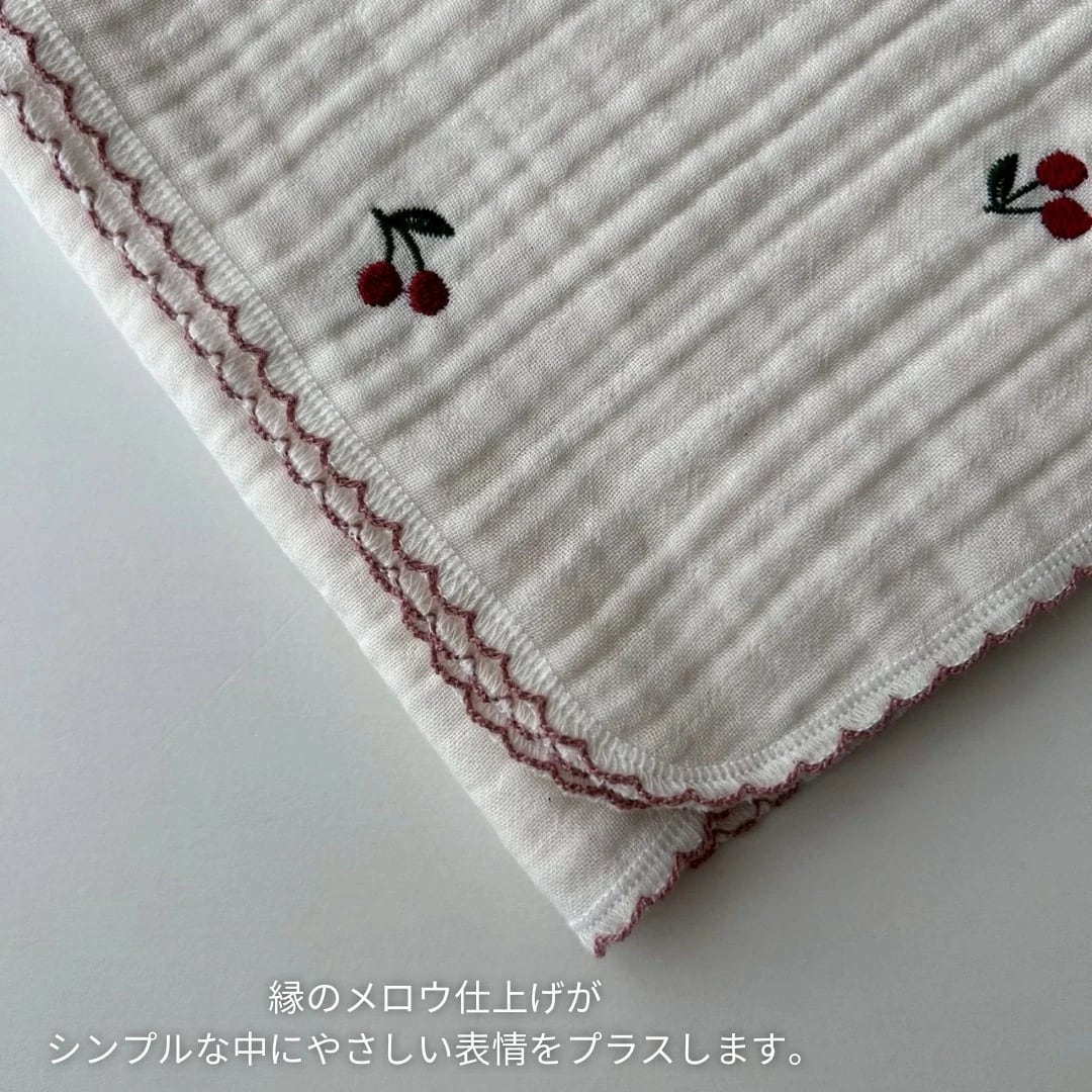 さりげない星・月・チェリーの刺繍と、やわらかな縁取りデザインがポイント。
