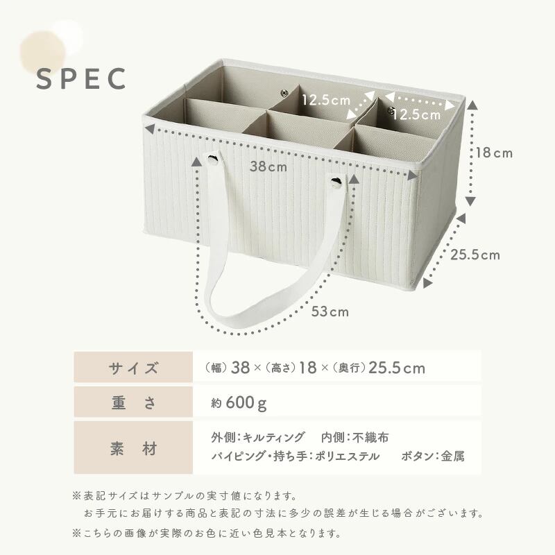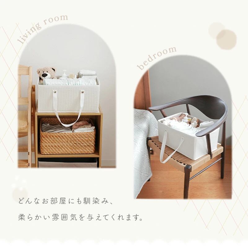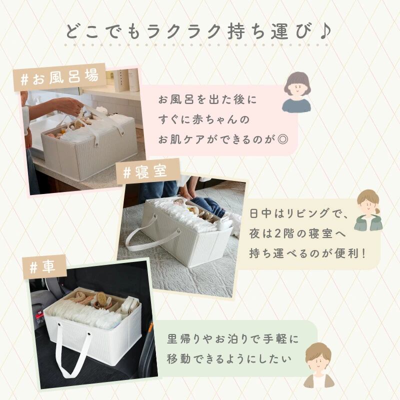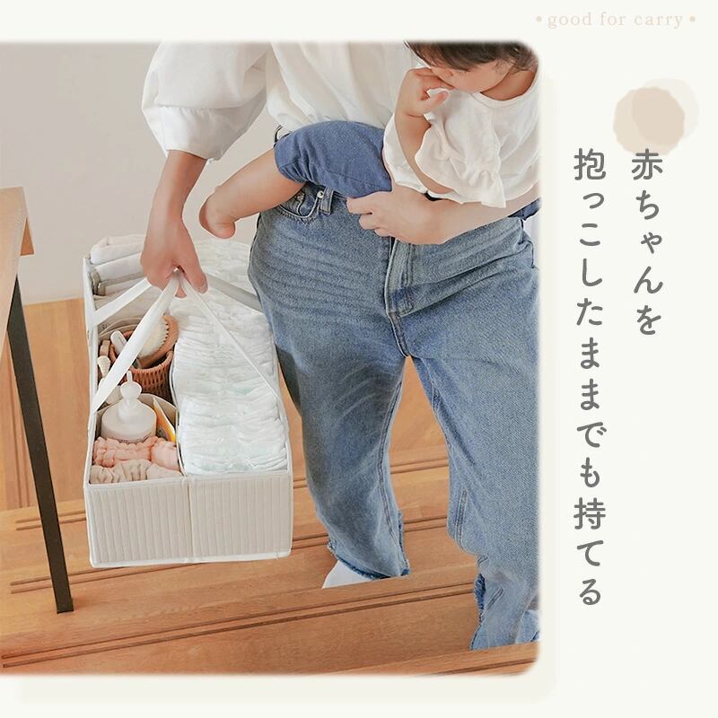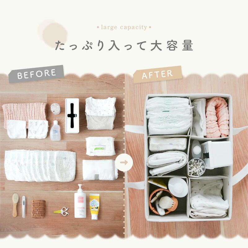 大容量だからおむつだけじゃなく、日々のケア用品やお着替えも一緒に持ち運べます。
